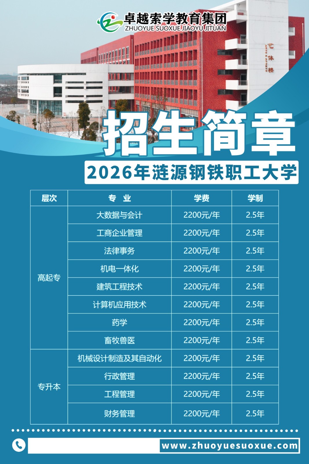 涟源钢铁总厂职工大学 [湖南钢铁工业职工大学(筹)] 是经湖南省人民政府批准,教育部备案的国家公办成人高等院校。学校位于全国优秀旅游城市、全国卫生城市、中国十大宜居城市之一的湖南省娄底市。学校办学历史悠久、底蕴深厚、人杰地灵。
